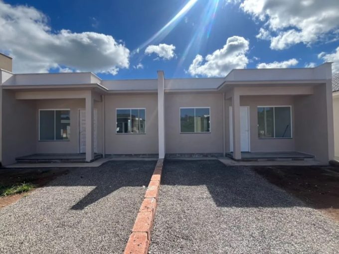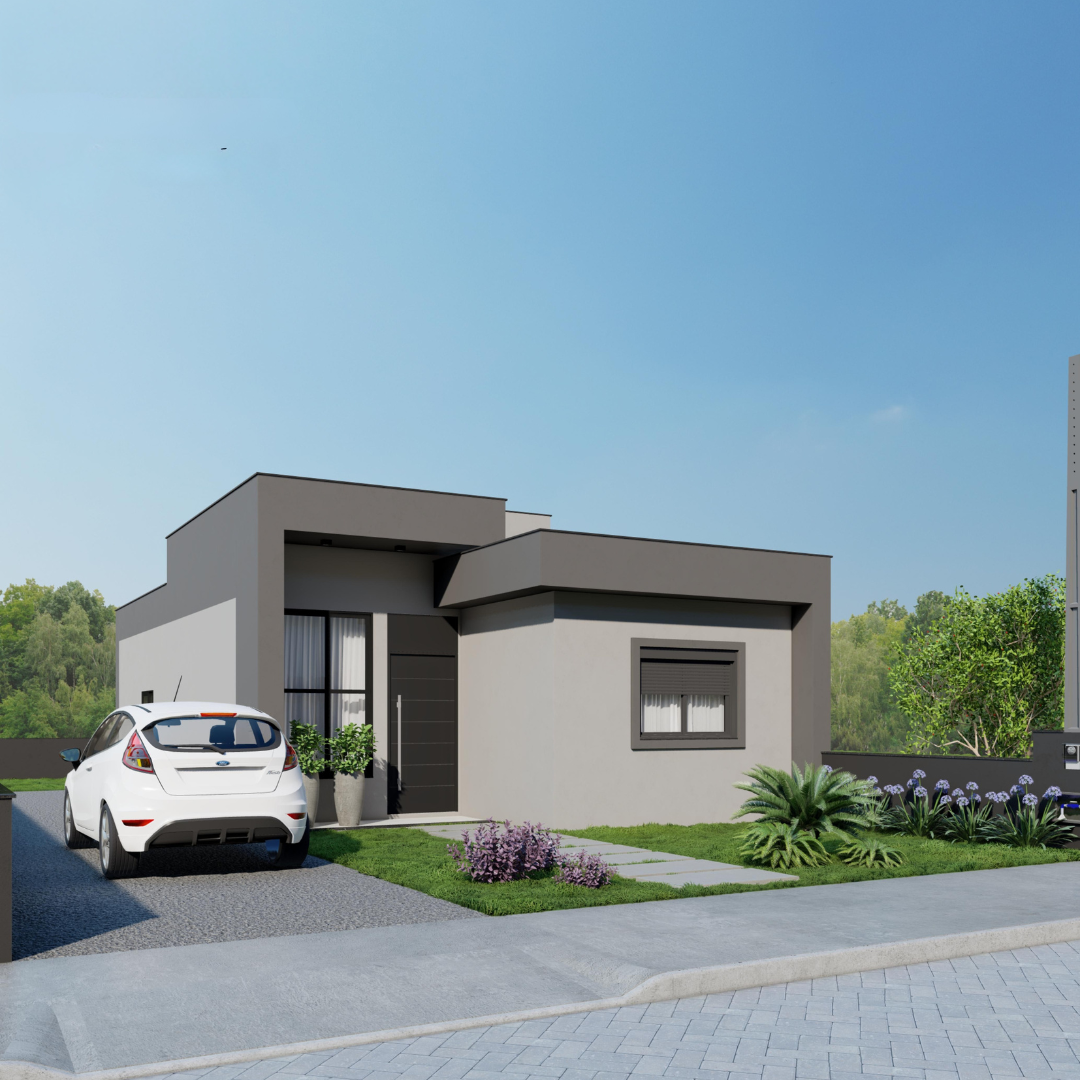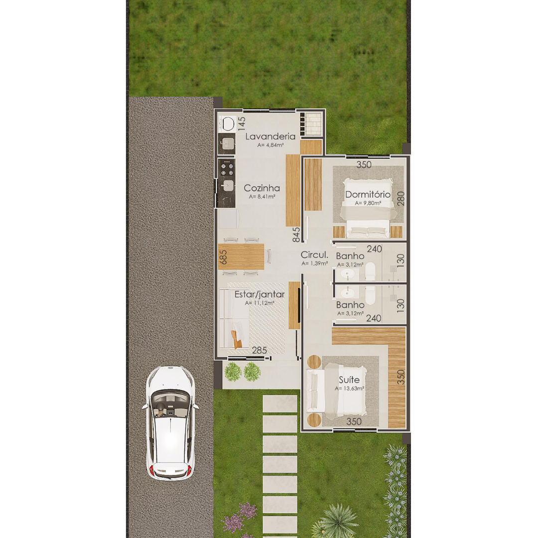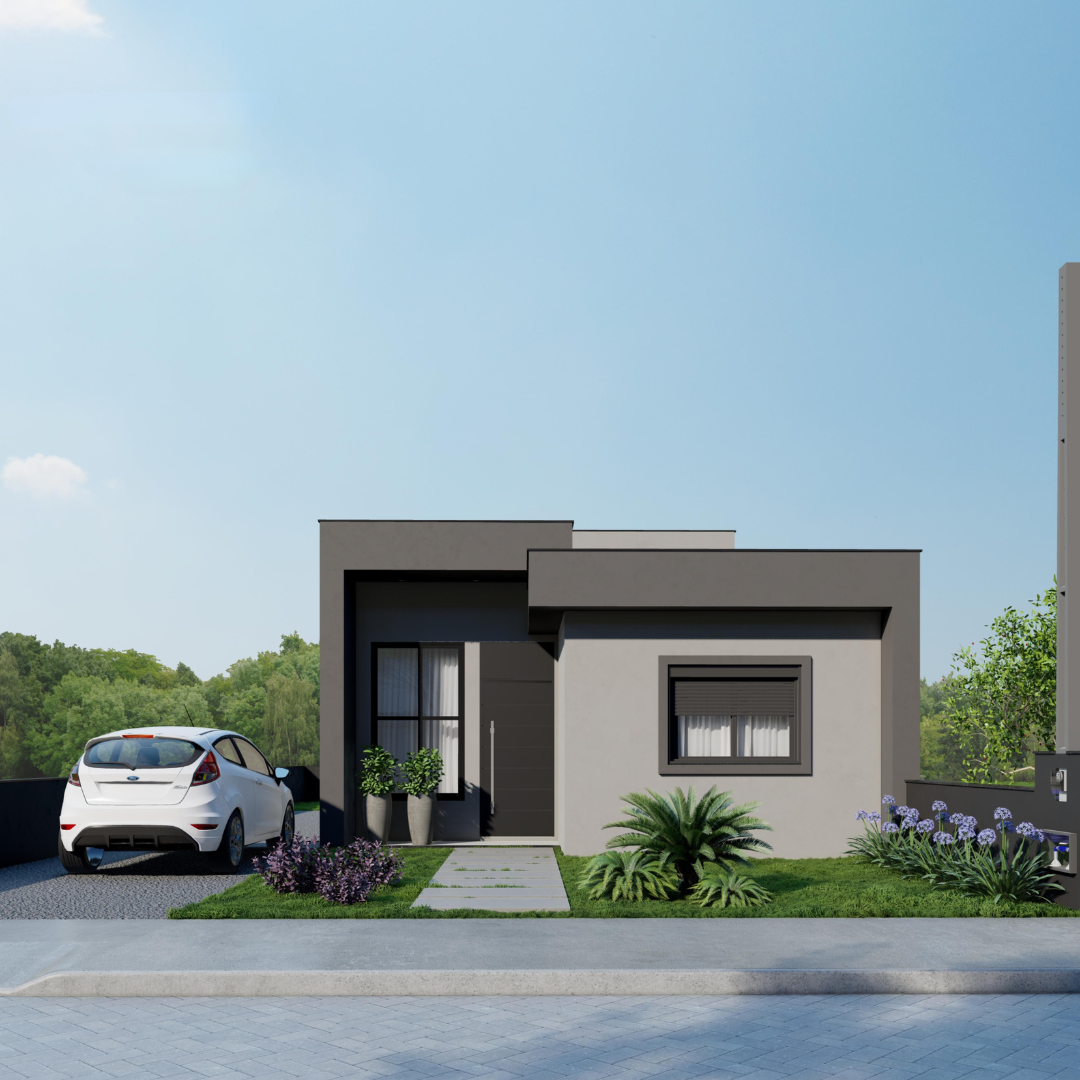 Área construída: 67,84 m², Sala de estar com pé direito alto, integrada com a cozinha, 2 dormitórios (sendo 1 suíte), Banheiro social, Área de serviço, Vaga de estacionamento lateral e Gramado e jardim na área externa