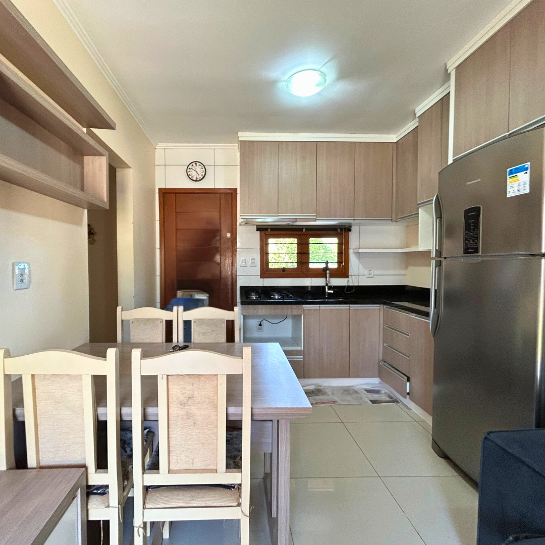 Cozinha equipada com móveis sob medida, geladeira e mesa;