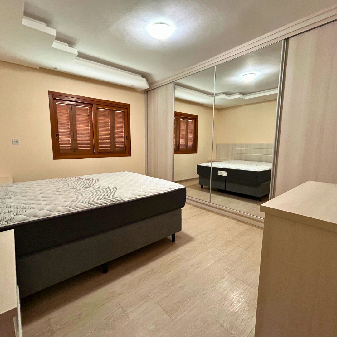 Dormitório com cama, roupeiro e móveis planejados;