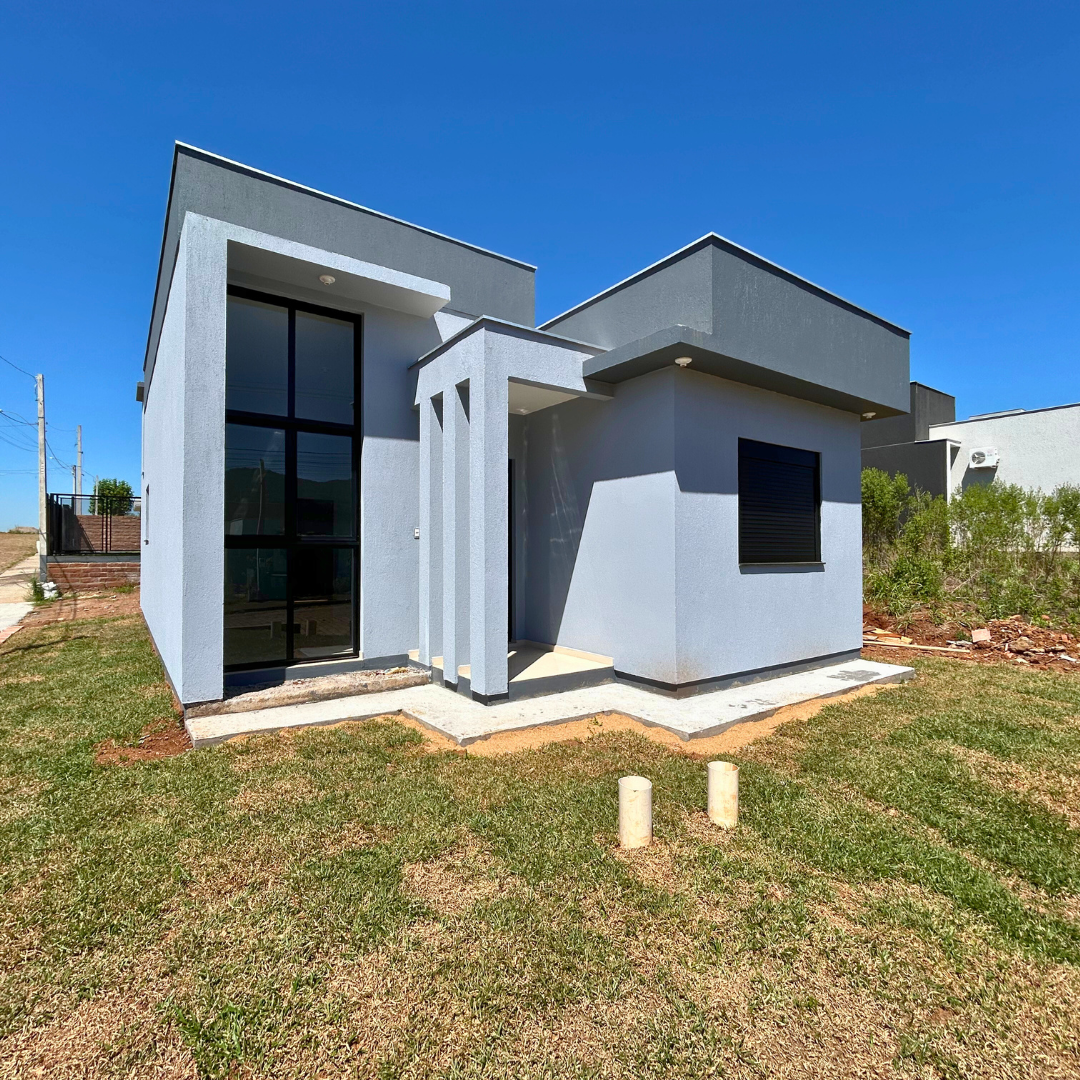 Com 69,85m², essa casa conta com sala e cozinha integradas com pé direito alto, 2 dormitórios (sendo 1 suíte), banheiro social, área de serviço e pátio na frente e nos fundos.