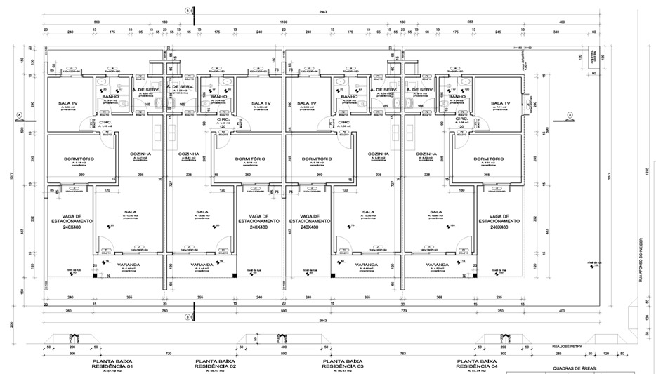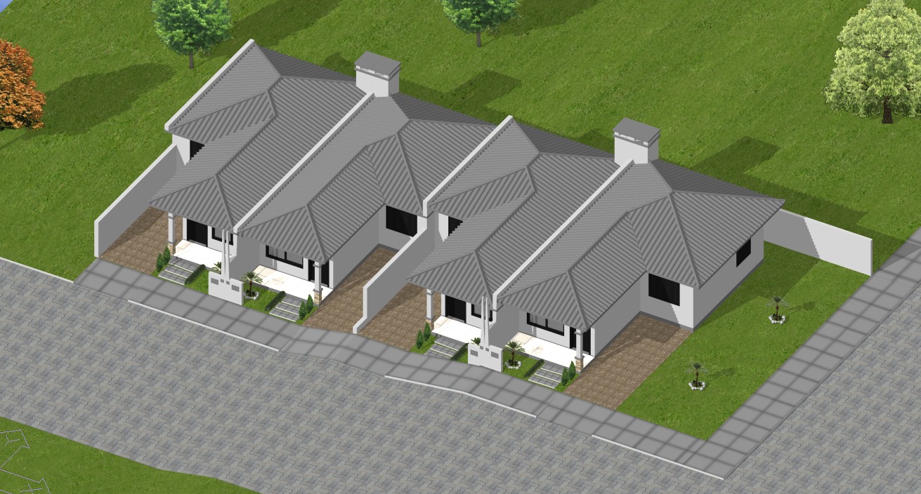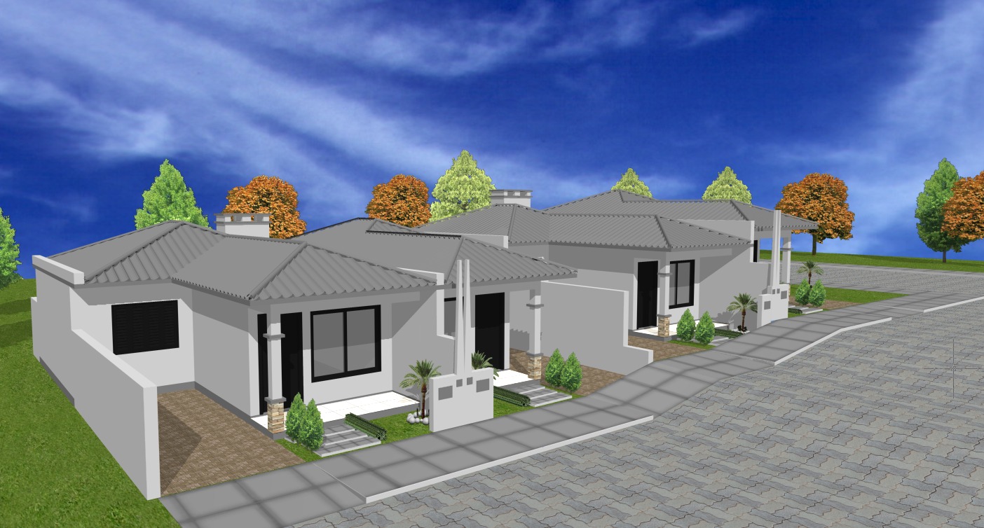 Cada unidade possui 57m² de área construída, distribuídos em: Sala de estar, Cozinha, 2 dormitórios, Banheiro social, Churrasqueira, Área de serviço e Vaga de garagem.