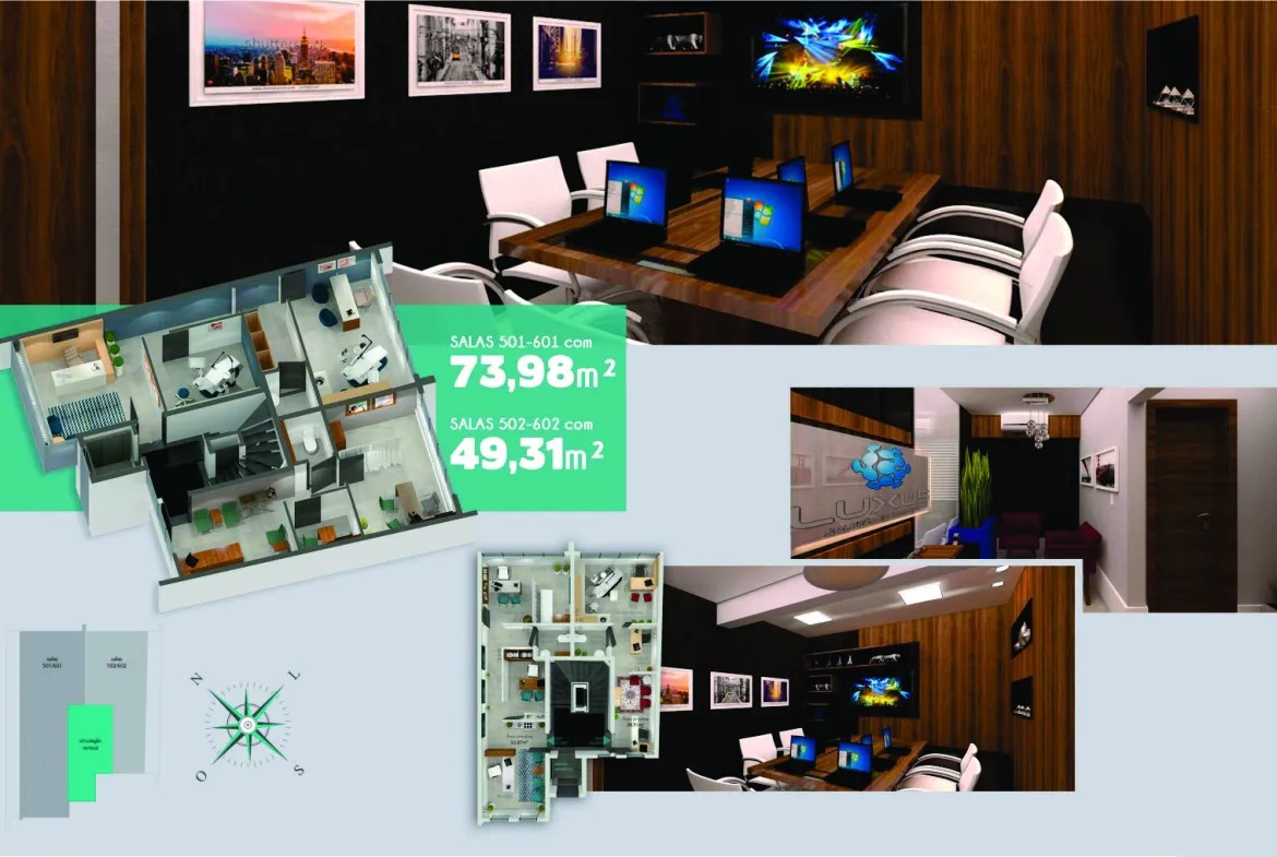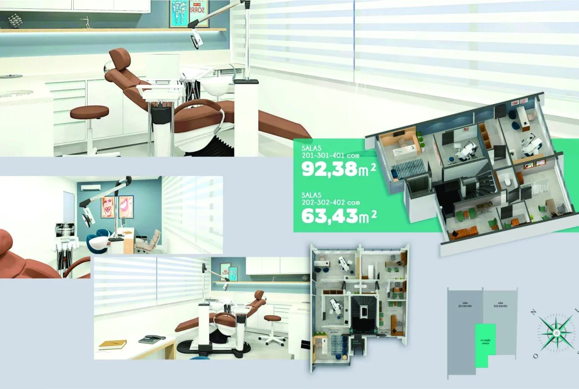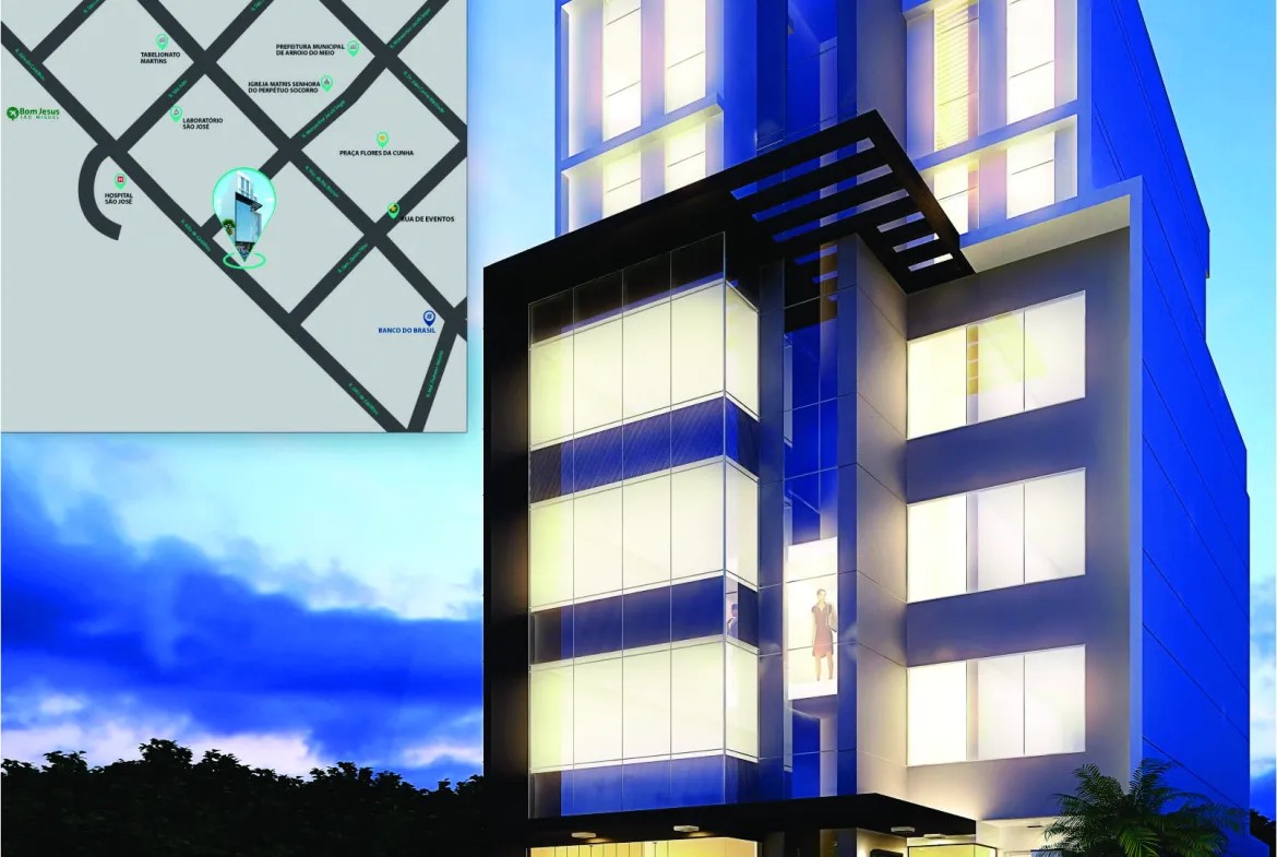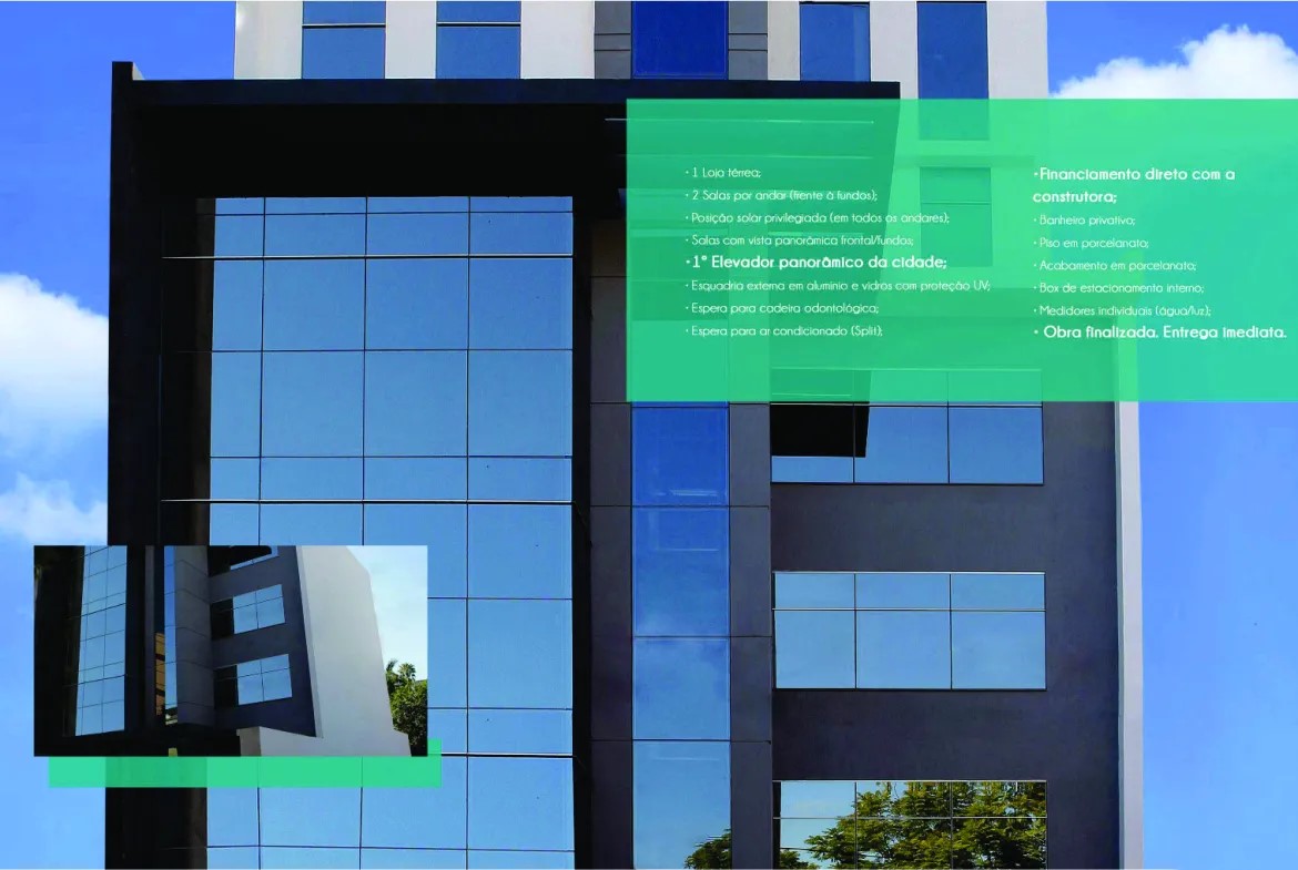 Planejado e construído com design arrojado, revestimento de primeira linha, piso porcelanato e vidros laminados reflexivos. 2 salas por andar, frente a fundos , salas com vista panorâmica, espera para cadeira odontológica, espera para ar condicionado split, banheiro privativo e box de estacionamento interno.